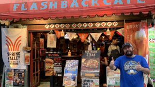 いつも横を歩いては目が吸い付いていくバーガー屋さんにこの日は行くことができました。そのお店の名前は「フラッシュバックカフェ」。4時半頃だったのですが、お店のカウンターでは海外の人たちが酒を飲んでおり、僕たちが食べている途中でサラリーマンのおひとり様も気軽に入ってきていました。